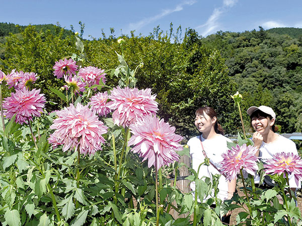 小鹿野町両神薄の両神山麓花の郷「ダリア園」が今月開園し、山間部の斜面に咲き誇る色鮮やかな花が訪れた人々を喜ばせている。