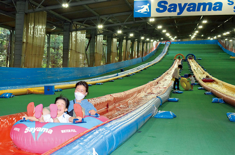 狭山スキー場は冬から春にかけて営業しているが、夏季にも施設を活用しようと、一昨年からウォーターフェスを始めた。最大傾斜15度のゲレンデに設置された全長220メートルのロングスライダー(1台)と140メートルのファミリースライダー(2台)が売りだ。