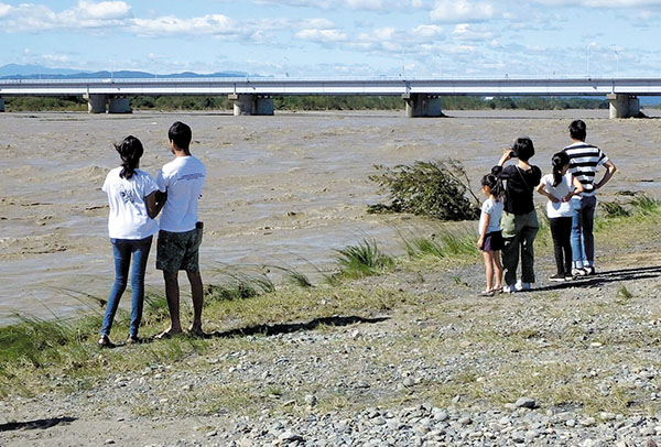台風19号による増水で荒川が一時、氾濫危険水位に達した熊谷市は市内の小中学校など48カ所に避難所を開設し、荒川流域に避難指示を出した。一夜明けた13日、荒川大橋付近の河川敷には大勢の市民が集まり、茶色く染まった濁流を眺めていた。