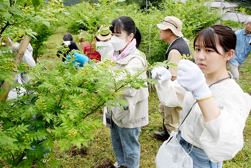 山の幸・山椒(さんしょう)を「町の特産にしよう」と取り組んでいる、埼玉県ときがわ町の「ときがわ山椒栽培協議会」(岩田泰治会長、会員52人)は20日、「青実山椒 摘み取り体験&試食会」を開催、町内外から参加した約60人が、山里の山椒園で青実山椒を収穫、山椒料理を堪能した。