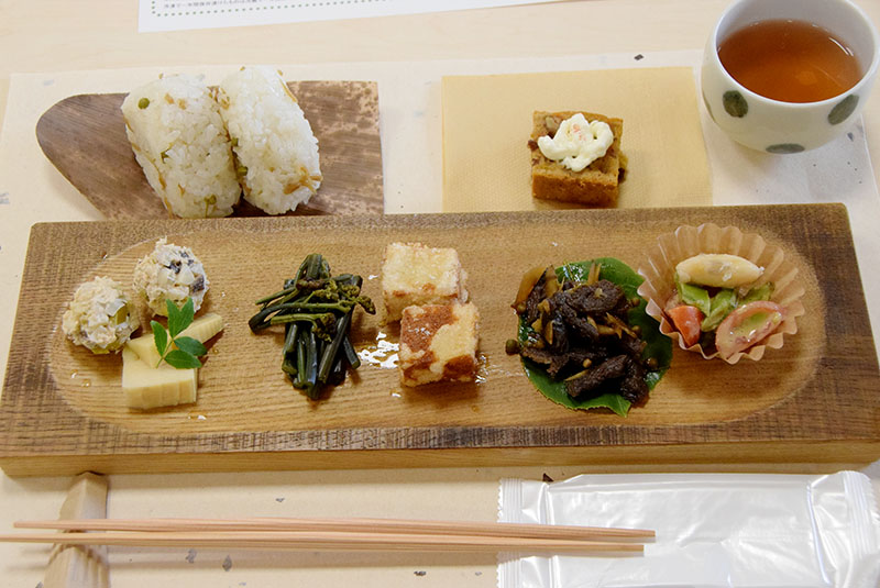 この後、大野くすの木センターで、白戸啓子さんらが山椒を使って料理した「ちりめん山椒おにぎり」「わらびのお浸し山椒醤油」「煮揚げ高野豆腐の山椒塩」「ごぼうと鹿肉の有馬煮」「キャロットケーキ」など、7種類の料理を食べた。