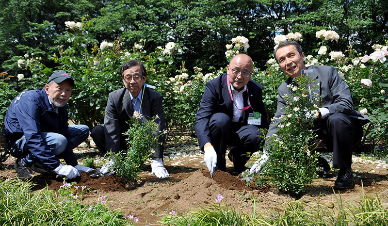 17日の植樹式では、北里区長が「由来を知って胸がつまる思い。戦争では子どもや弱い人が犠牲になる。ウクライナ侵攻が続く中、多くの人に知ってほしい」とあいさつ。小野寺さんの次男で、東松山聖ルカ教会(東松山市)の牧師・達さん(72)も駆け付け、「長年住んださいたま市に植樹され、父も喜んでいると思う。父は『バラづくりは文化である』とよく言っていた。平和への思いが広がればうれしい」と語った。