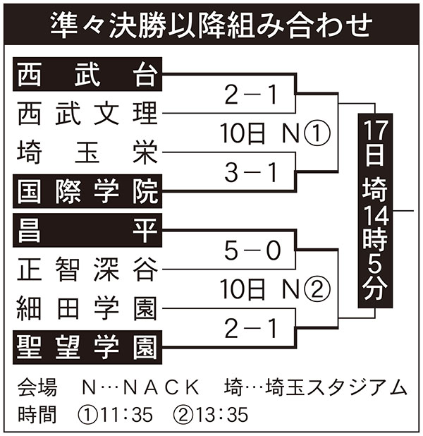 第98回全国高校サッカー選手権埼玉大会(埼玉新聞社など後援)第6日は10日、NACK5スタジアム大宮で準決勝2試合を行い、西武台―国際学院(11時35分)、昌平―聖望学園(13時35分)が顔を合わせる。17日に埼玉スタジアムで行われる決勝の切符を懸け、熱戦が期待される両カードの見どころを探った。