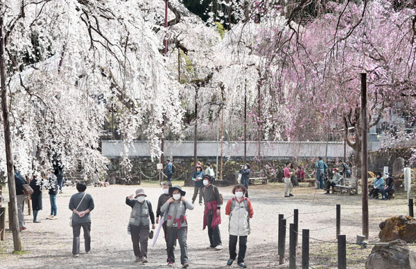 <新型肺炎>屋外なので大丈夫? シダレザクラ見頃の秩父・清雲寺、観光客でにぎわう 桜まつりは中止