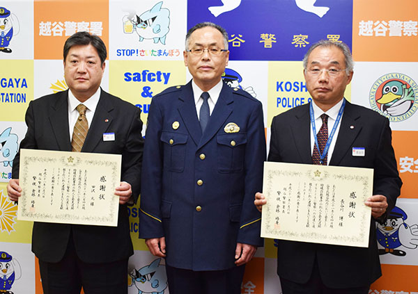 詐欺事件の犯人逮捕に貢献したとして、越谷署は、東京東信用金庫大袋支店北越谷出張所の長谷川博さん(61)と田沢元さん(56)に感謝状を贈った。