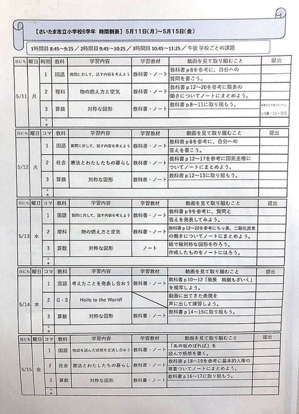新型コロナウイルスの影響で、さいたま市立学校の臨時休校が続いている中、市教委は11日、デジタル授業を開始した。全小中学校の児童生徒約10万人が対象で、子どもたちは各学校の教諭が作製した10~15分の動画をパソコンなどで視聴した。1時限40分で、時間割に基づいて午前8時45分から3時限が行われた。