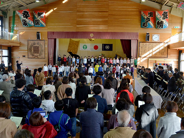 94(平成6)年から2年間校長を務め歴代校長代表としてあいさつした仁部弥生さんは、児童と小凧作りに励んだ思い出に触れ「凧の文化が引き継がれ、地域と一体となった学校だった。凧作りを通じて生きる目標を掲げる自慢できる行事だった」と回顧。「新しい学校は全国から注目を集めている。4月からは新たな第一歩を踏み出してほしい」と述べた。