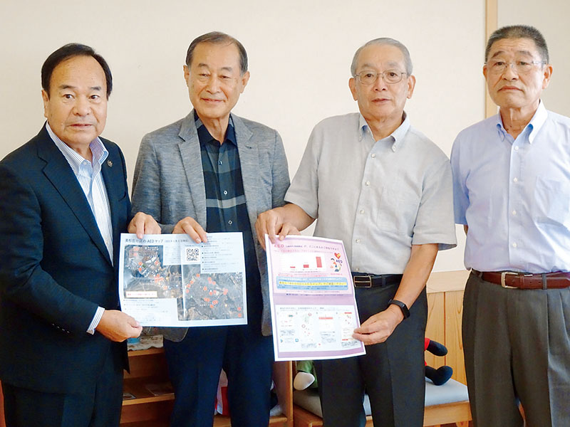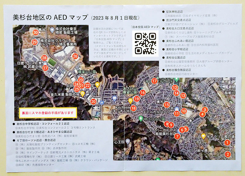 飯能市の美杉台地区で自動体外式除細動器(AED)の設置場所を示したマップが完成した。心臓発作の後遺症の高次脳機能障害と闘う息子を持つ男性らが、地区の施設や事業所を調査。紙ベースの地図とともに、利用可能な日時などの情報をスマートフォンのアプリから得られる環境を整えた。「息子が倒れたあの時に、AEDが身近にあったら」。そんな思いが込められたマップに、市社会福祉協議会の会長でもある新井重治市長は「心強いものができた」と話した。