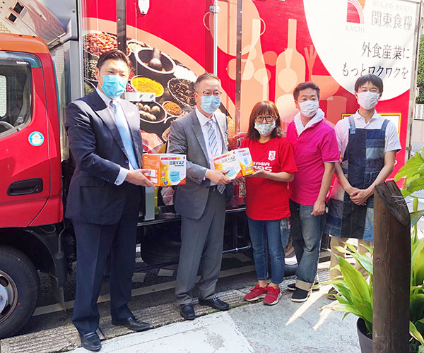 • 県子ども食堂ネットワークの本間香代表(中央)と関東食糧の臼田真一朗社長(左から2人目)ら=29日午前、さいたま市緑区