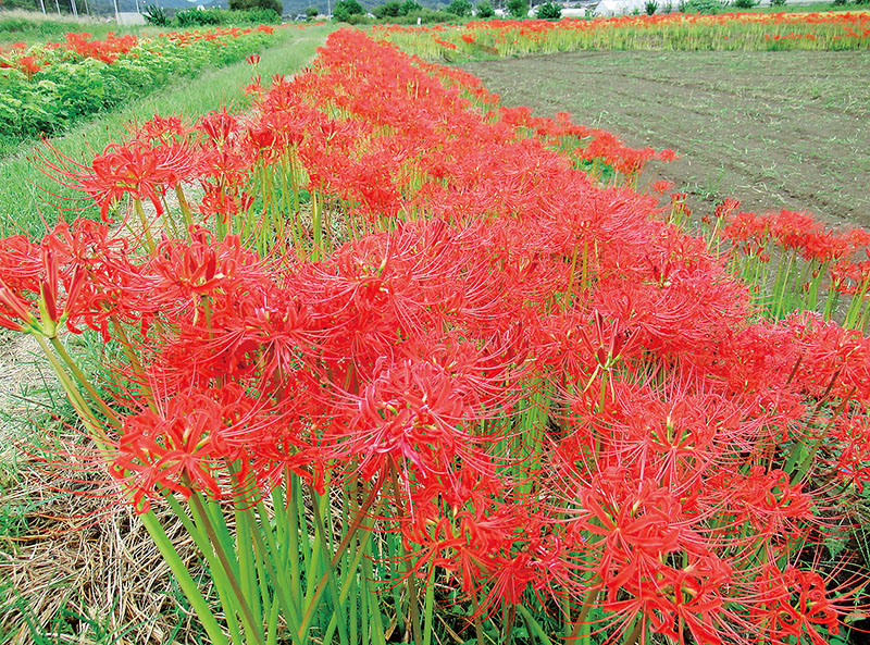 本庄市児玉町秋山地内を流れる水押川の両側約1キロで自生しているマンジュシャゲがようやく開花した。ヒガンバナとも呼ばれ、秋空の下で元気よく咲き誇っている。