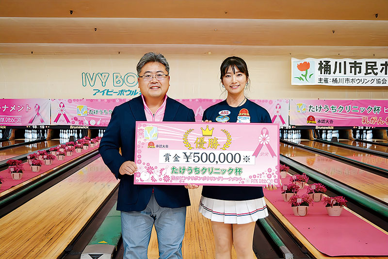 乳がん撲滅を目指すピンクリボン運動の一環として、乳がん検診向上を呼びかける「たけうちクリニック杯 花のピンクリボンボウリングトーナメント」が埼玉県北本市のアイビーボウル北本で開かれた。