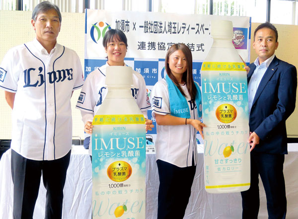 加須市を本拠地に誕生した女子硬式野球のクラブチーム「埼玉西武ライオンズ・レディース」を激励しようと、キリンビバレッジ首都圏地区本部埼玉支社(さいたま市大宮区)が16日、チームに乳酸菌飲料「キリン i MUSE(イミューズ)レモンと乳酸菌」の500ミリリットルペットボトル千本を加須市役所で贈呈した。