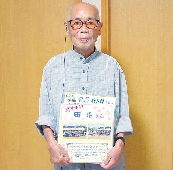 「B29爆撃機が上空約1万メートルから計36本に束ねた焼夷弾(しょういだん)を落下。上空約700メートルで分解され、散らばった無数の子爆弾が家屋に突き刺さり、瞬く間に炎が上がった」。羽生市の田沼杵太郎さん(96)は、東京を襲った空襲の中で最も被害が大きかった1945年3月10日の東京大空襲の惨状を目の当たりにした。地元の小学生に戦争体験を伝えており、「命のある限り、戦争の恐ろしさを伝えていく」と力を込める。