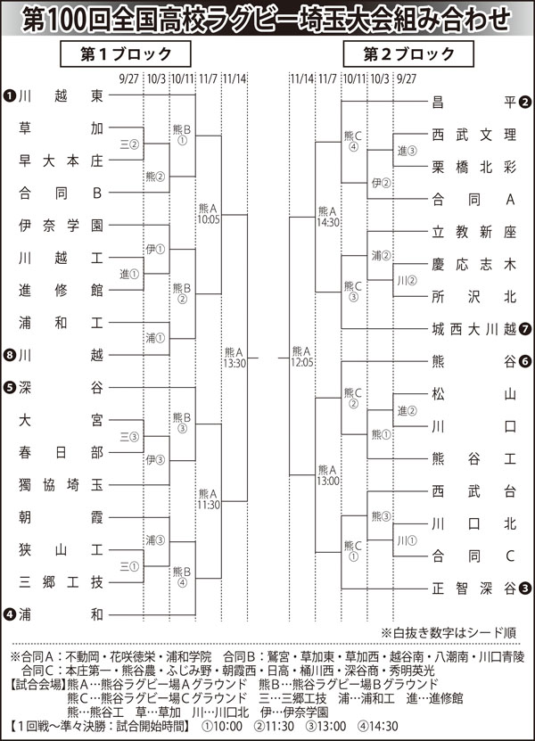 ラグビーの第100回全国高校埼玉大会(埼玉新聞社など後援)の組み合わせ抽選会が21日、熊谷ラグビー場で行われ、出場33チームの対戦カードが決まった。今大会は記念大会のため、埼玉代表が1増の2校となる。第1、第2の各ブロックに分かれてトーナメント方式で行われ、各ブロックの優勝校が全国高校大会(12月27日~来年1月9日・花園ラグビー場)に出場する。