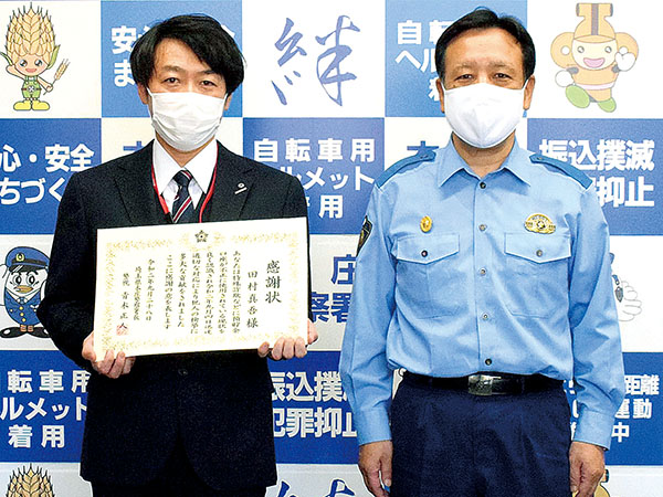紛失届の出されている通帳を使おうとしている利用者に声を掛け、犯罪収益移転防止法違反容疑の男の逮捕に貢献したとして本庄署は28日、本庄早稲田駅前郵便局の局長田村真吾さん(44)に感謝状を贈呈した。