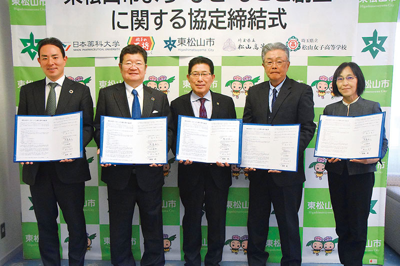 東松山市とゆかりのある産官学の5者が連携して新商品を開発する協定締結式が19日、同市役所で行われた。森田光一市長、全国で中華チェーン「餃子(ぎょうざ)の王将」を展開し、同市内に工場を置く王将フードサービス(京都市)の渡辺直人社長ら各代表者が署名した。協力して新商品を開発するなど、「食と健康を生かした地域活性化」を推進する。