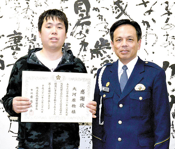 2月9日深夜、雪が舞う蕨市錦町の路上で、植え込みに倒れ込んだ女性(80)を助け起こし、徒歩やタクシーで約2時間かけて川口市内の自宅に送り届けたとして、武南署は、川口市芝中田、パート従業員大河原稔さん(34)に感謝状を贈った。斎藤正士署長は、「雪で厳しく冷え込んだ夜間のことで、女性を放置すれば命が危険だった」と、大河原さんの行動をたたえた。