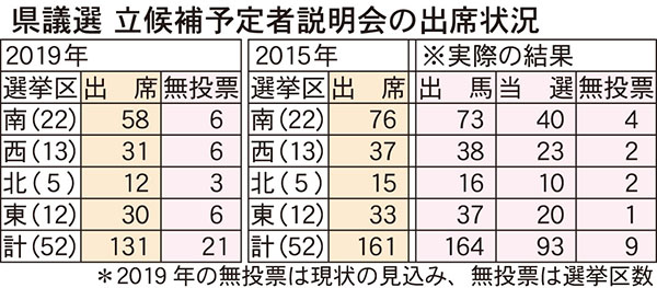 統一地方選の前半戦となる県議選の29日の告示まで、2週間余りとなった。県内4地域で2月に立候補予定者説明会、3月6、7日には事前審査が行われ、主要政党を中心に顔触れが固まってきた。説明会に出席したのは計131陣営で、前回(2015年)の計161陣営(最終的に164人出馬)と比べて30陣営少なかった。県議会最大会派の自民は新人を含めて着々と候補者を擁立する一方、野党の動きが鈍いのが要因の一つ。無投票は前回の9選挙区を大幅に上回り、20選挙区前後になる見通し。投開票は4月7日。