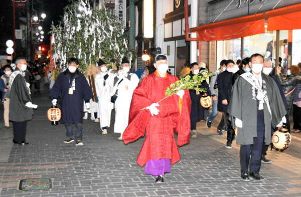 秩父夜祭は秩父神社の女神・妙見様と武甲山の男神・龍神様が年に1度、逢瀬を楽しむ祭りといわれる。午後6時になると、同神社から龍神様を乗せた御神幸行列が神々の出会うと場所とされる御旅所へ出発。今年は規模を縮小し、御神輿(みこし)は出ず、コースも32年ぶりに同神社の表参道である番場通りを往復して短縮された。