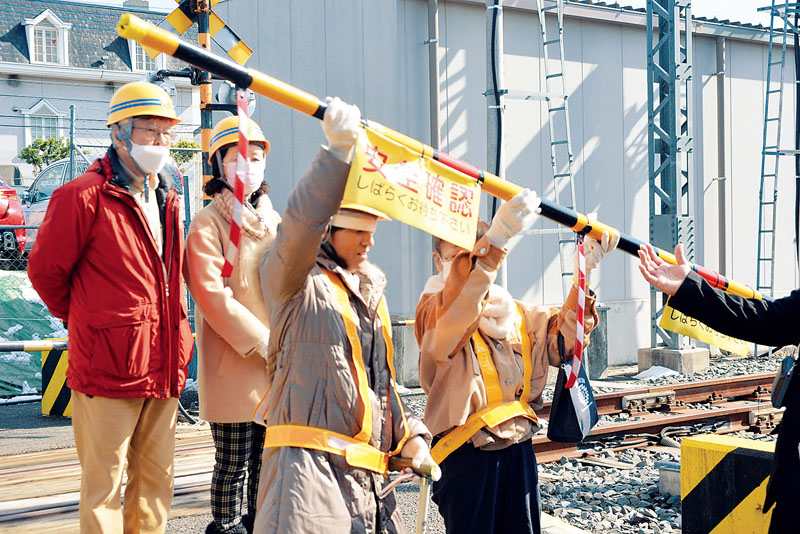 参加者は踏切の仕組みを職員から学んだ。実際に踏切内を何度も歩き、段差や溝の深さ、線路の幅などを確認した。万が一踏切内に取り残された場合に脱出する体験では、遮断棹(かん)と呼ばれる踏切の棒を斜め前に押し上げる方法を試した。参加者が実際に押すと、棒が重く角度が難しいなど実感した。