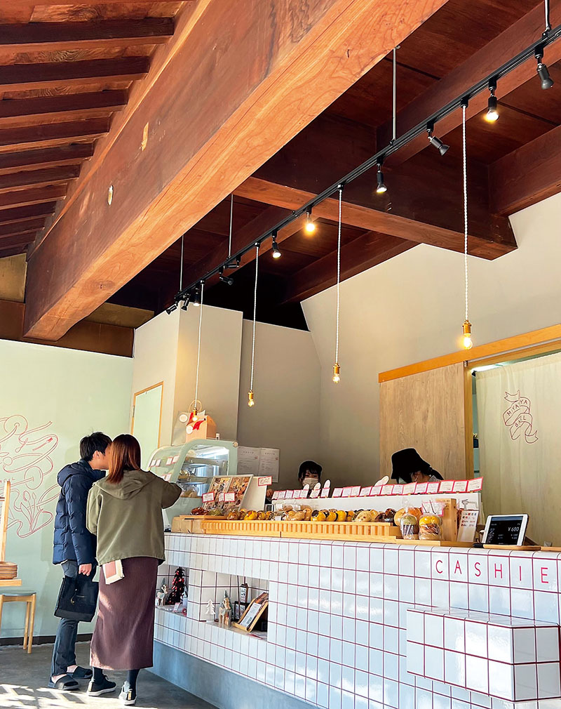 天井が高く開放的な店内ではベーグルに目線が集中する。彩りもよく、並んだベーグルを前にどれにするか迷っていると、「ちょっと上を見てください」と浅野さん。店内の真上に見たことのないくらい大きな梁(はり)がある。今回の改装工事で現れ、店のシンボルになったという。