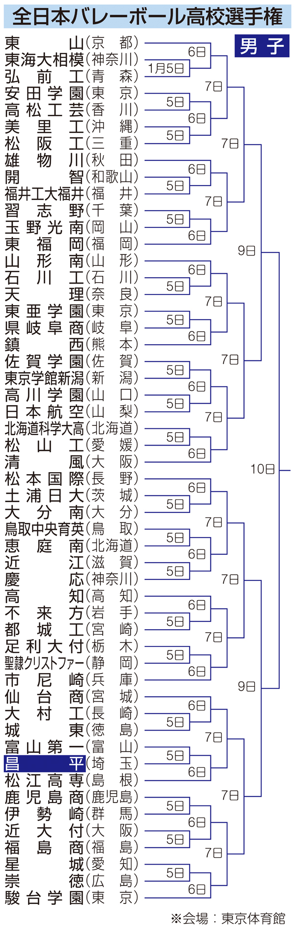 バレーボールの全日本高校選手権は5日、東京体育館で男女各52校が参加して開幕する。10日の決勝まで熱戦が繰り広げられ、県勢では初出場となる男子の昌平が5日の1回戦で、富山第一(富山)と対戦(13時20分開始予定)。6大会ぶり15度目の出場を果たした女子の春日部共栄は同日の1回戦で、金沢商(石川)と顔を合わせる(9時開始予定)。「春高」の夢舞台での活躍を誓う両校を紹介する。