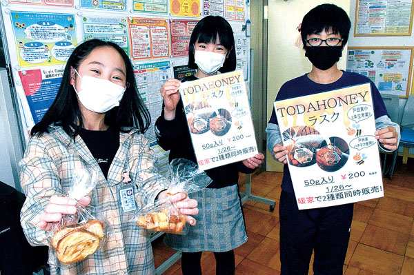 埼玉県戸田市立東小学校(小高美恵子校長)の6年生3人が、戸田商工会が商工会館屋上の養蜂場で作る蜂蜜と市内の自家製パン店を結び付けた「戸田ハニー・ラスク」を考案。同店が26日から1カ月間、製造販売することになった。「戸田に新しい名物を」という3人の熱意に応えた。