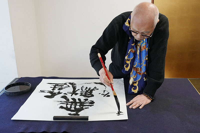 秋元康さんの信条「人生無駄なし」を揮毫する金田石城さん