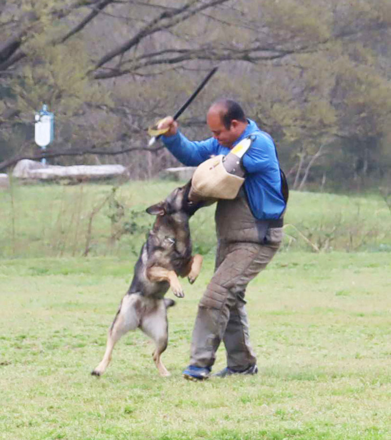 犯人役の男性に飛びかかり、かみつく訓練犬=5日午前、埼玉県さいたま市桜区の秋ケ瀬公園