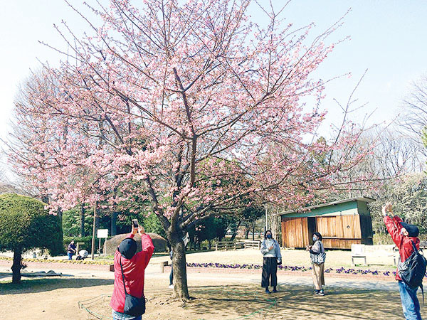 埼玉県さいたま市南区の別所沼公園で22日、河津桜が早くも見頃になっている。三寒四温の暖かい日が続き開花が進んだようだ。