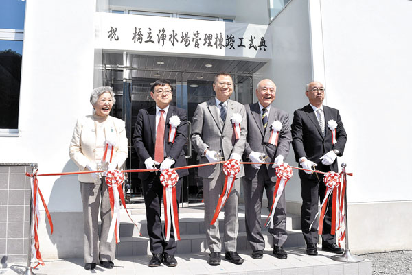 秩父広域市町村圏組合水道局は20日、秩父地域の基幹浄水場である秩父市荒川久那の橋立浄水場で、同浄水場の管理棟の竣工(しゅんこう)式典を行い、集まった関係者約40人が完成を祝った。旧管理棟は1961年の建築で、建物や電気機械設備が老朽化。2016年度から3カ年計画で工事を実施していた。