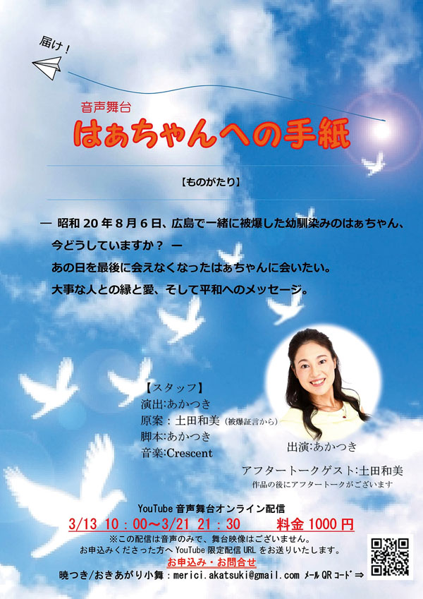 「はぁちゃんへの手紙」は、同じ草加に住む俳優の暁つきさん(41)が一人で演じる。暁さんは土田さんの被爆証言や正木さんへの手紙、被爆者の証言集を読むなどして脚本を書き上げた。劇団シェークスピア・シアターに約10年在籍していた暁さんは「土田さんの体験は、シェークスピアに通じる。会いたいと願った人と再会できた幸せを描きたい」と語った。
