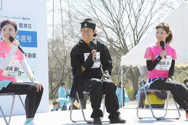 川内優輝選手、地元の久喜マラソンで公務員ラストラン 忍者コスプレ「暑い」 沿道から「結婚おめでとう」 2019/03/25/00:00 久喜高の同僚らの応援を受け、ゴールテープを切る川内優輝選手=24日、久喜市総合運動公園 トークショーに登場した川内選手(中央)=24日、久喜市総合運動公園 この写真の記事に戻る