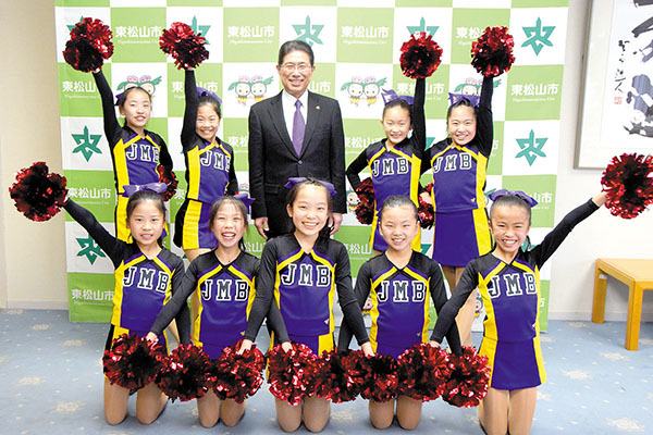 チアダンスの全国選手権大会に初出場する東松山市の「JAMBOREE(ジャンボリー)ハイーズ」の選手9人らが22日、森田光一市長を表敬訪問した。