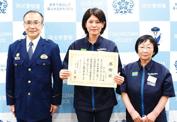 詐欺被害を未然に防いだとして所沢署は21日、コンビニ2店の店員とオーナーに感謝状を贈呈した。感謝状を受け取ったのはファミリーマート日吉町店のアルバイト店員矢ケ崎幸子さん(49)とセブンイレブン東所沢駅前店のオーナー山下実果さん(66)の2人。
