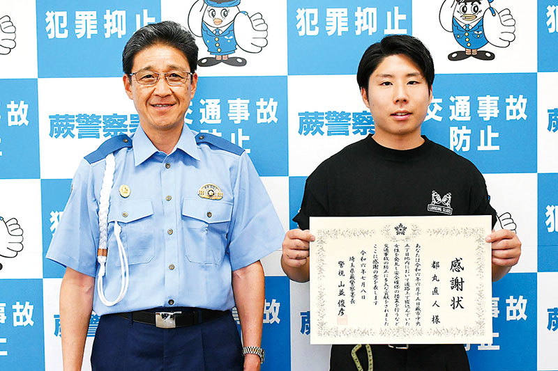 意識もうろう…20代女性が泥酔、男女トラブルで嘆き 明け方の車道中央で倒れ込む 気付いた男性、急いで助けようとすると…悲観した女性拒否「助けないで」 トラックにひかれそうな女性、男性が必死で抱えて一命 2024/07/10/10:11 感謝状を受けた都丸直人さん(右)と山並俊彦蕨署長=8日午後、蕨警察署 この写真の記事に戻る