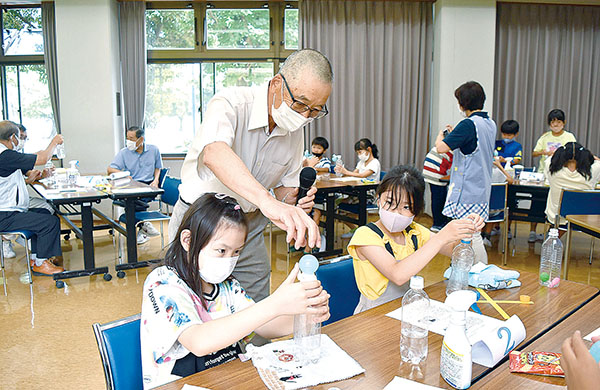 熊谷市在住の気象予報士下山紀夫さん(76)による講座「気象予報士さんと天気のひみつをさぐろう」(医療生協さいたま富士見支部運営委員会主催)が7月30日、熊谷市中央1丁目の市立箱田高齢者・児童ふれあいセンターで行われた。参加した市内の小学生約30人は雲を作る実験なども体験し、楽しみながら天気について学んだ。
