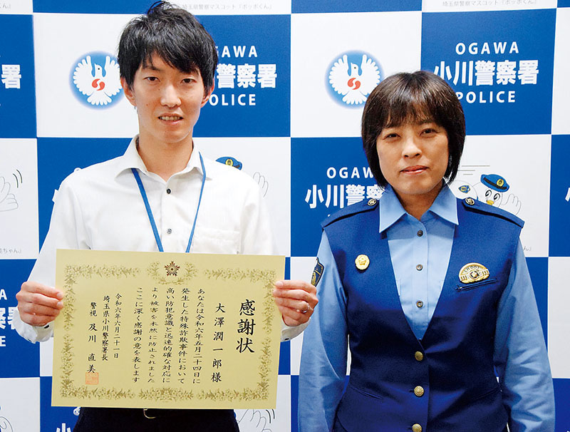特殊詐欺を未然防止したとして、埼玉県警小川署はときがわ町の埼玉中央農業協同組合ときがわ支店職員の大沢潤一郎さん(31)に感謝状を贈呈した。