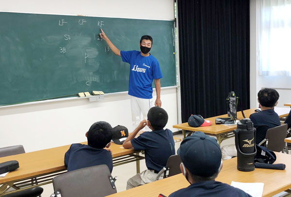 • 講義をする埼玉西武の星野智樹コーチ(球団提供)