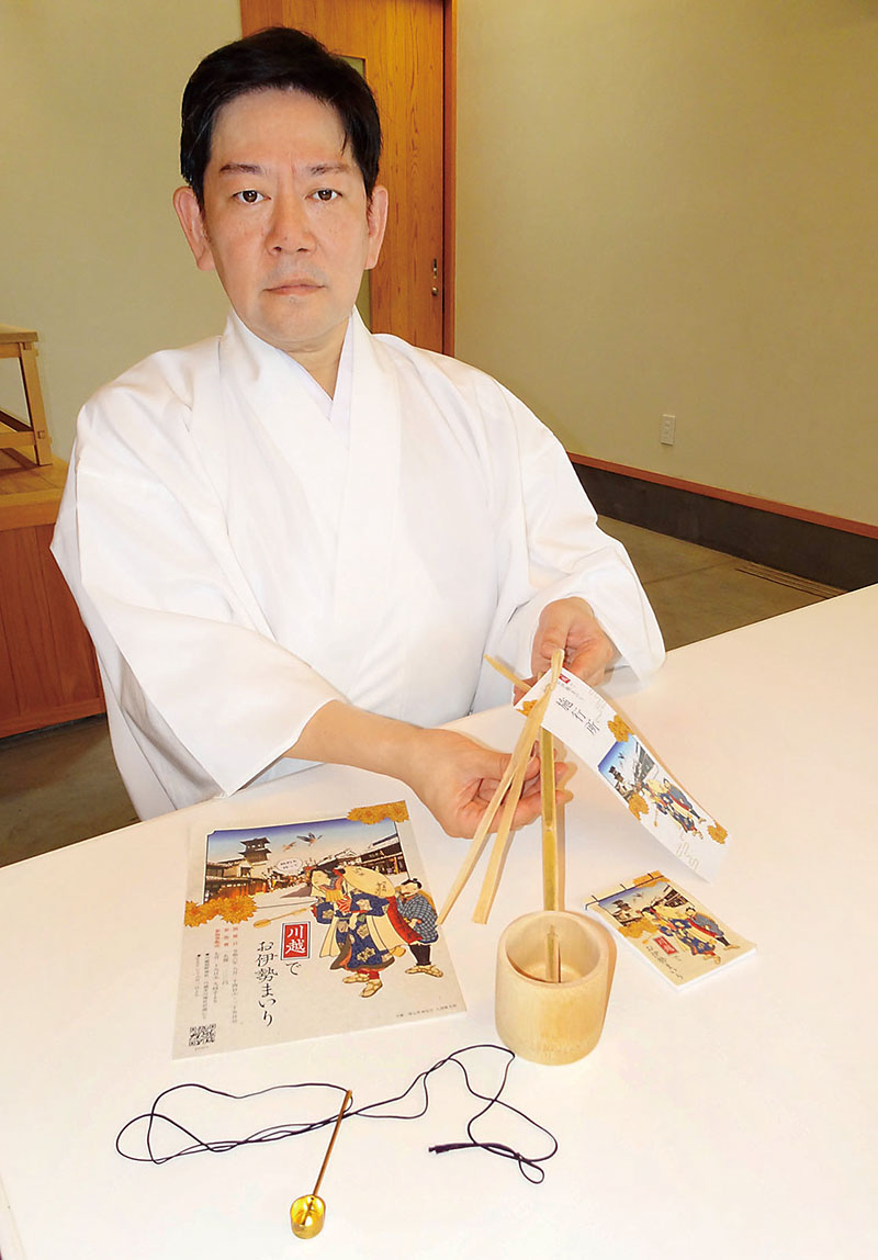 • 「川越でお伊勢まいり」で参加者が携える、ひしゃくのミニチュアなどを示す川越氷川神社の山田禎久宮司=13日、川越市内
