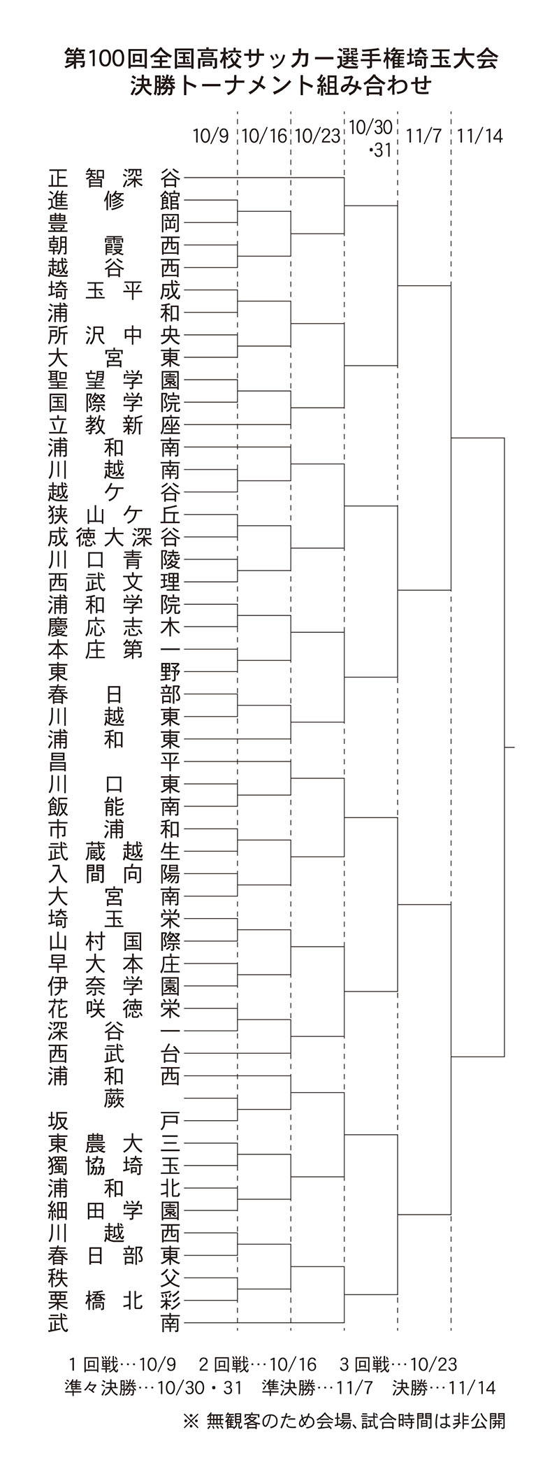サッカーの第100回全国高校選手権埼玉大会(埼玉新聞社など後援)決勝トーナメント(10月9、16、23、30、31日、11月7、14日)の組み合わせ抽選会が7日、埼玉スタジアムで行われ、出場52校の組み合わせが決定した。