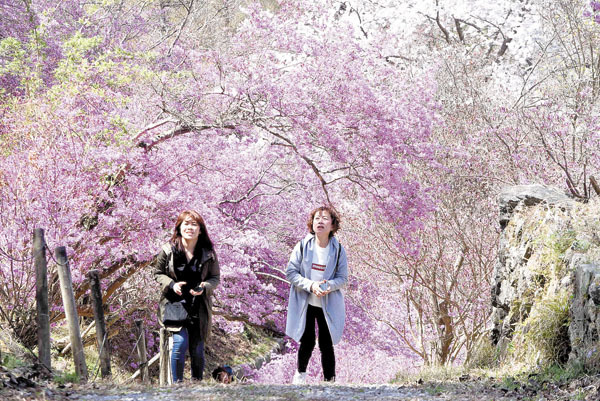 長瀞町井戸の岩根山ツツジ園が7日から開園し、色鮮やかな紫色のトンネルが訪れた人々を楽しませている。