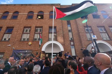 代表部前で「国旗」掲揚 英国家承認受けパレスチナ