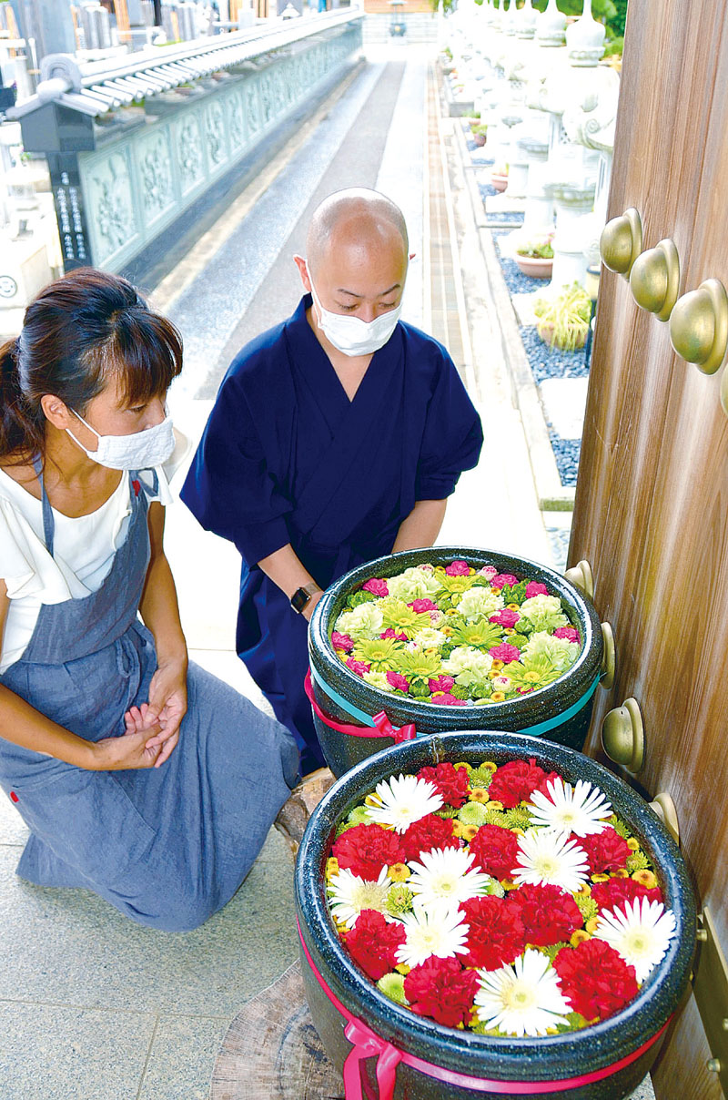 川越の寺院でフラワーアート、他界した漫画家・花村えい子さんをイメージ 手水鉢に鮮やかな花