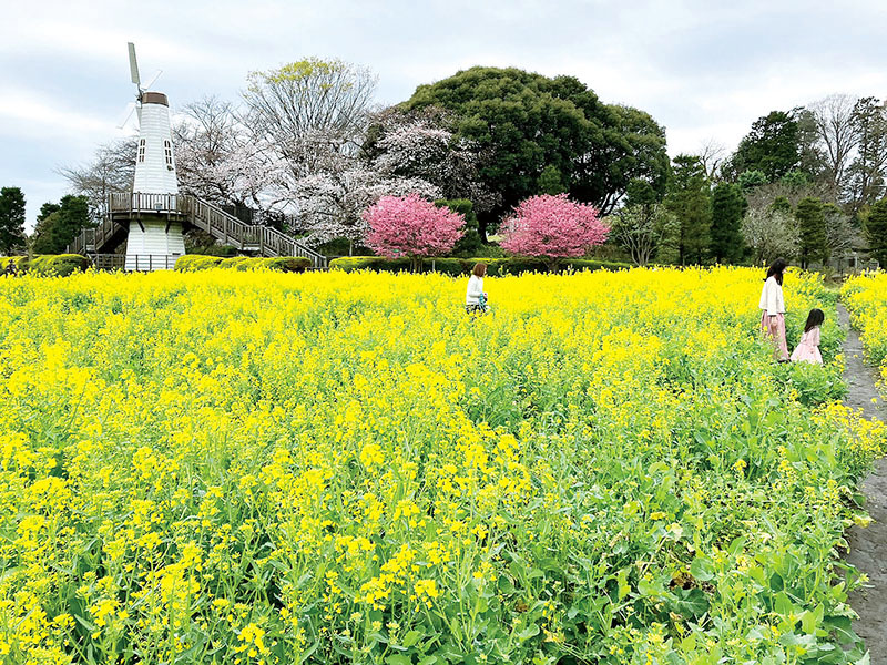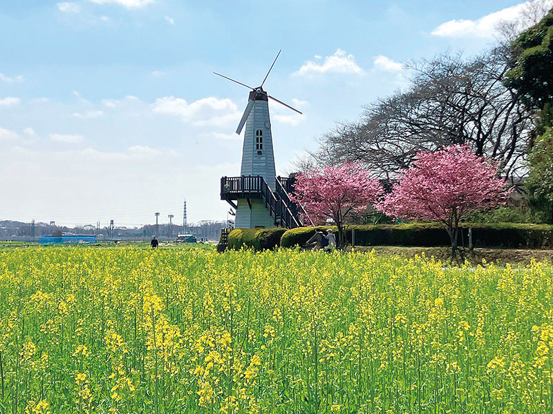 【動画】やさしいコントラスト、今が見頃! みやび桜と菜の花が競演、風車小屋も さいたま・見沼代用水西縁