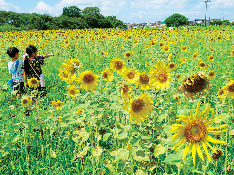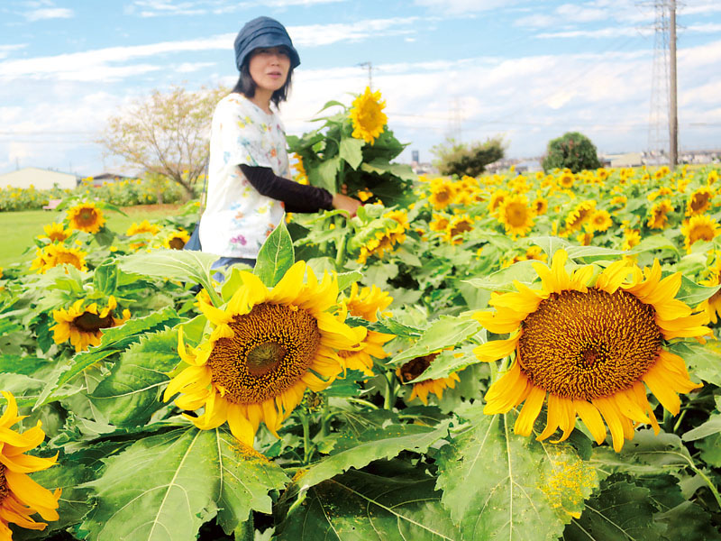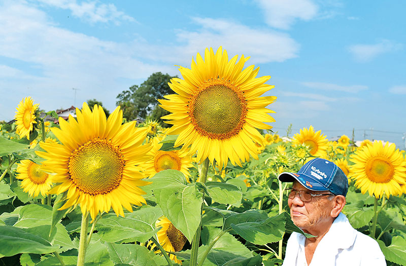 ヒマワリ15万本が見頃 幸手の権現堂 桜の名所、黄色に染まる 高さ1・5メートルの大輪…来園者ら散策や記念撮影し楽しむ 入園・駐車場は無料 10日からは刈り取りと持ち帰り自由に