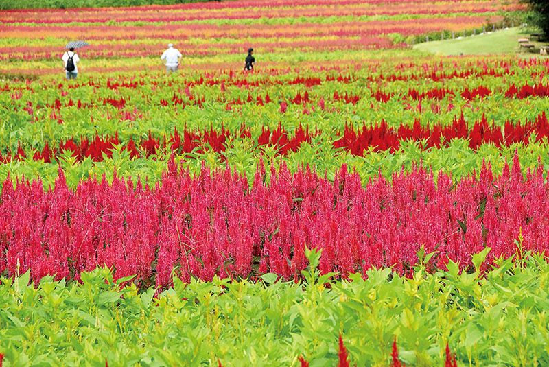 秋の気配、ようやく…40万本の羽毛ゲイトウが見頃に ふわふわ花穂が特徴、赤や黄色など5色の花が鮮やかに 滑川の森林公園で咲き誇る 10月中旬ごろまで