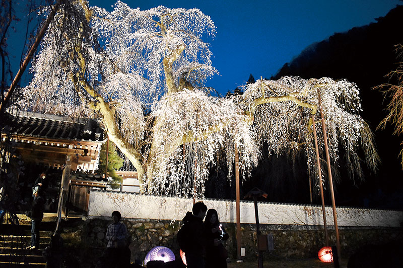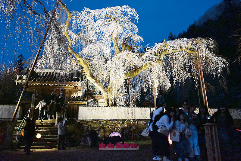 シダレザクラのライトアップ始まる 秩父の清雲寺、金・土曜限定 幻想的な明かり、風情豊かな本堂と調和 エドヒガンザクラは8部咲き ベニシダレザクラの満開は来月4日ごろ