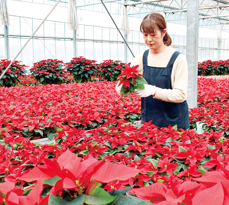 赤、ピンク、白…華やかな色彩の約5万鉢 ポインセチアの出荷始まる 暑さの影響などで色づき遅れる 人気は高さ20センチほどのサイズ