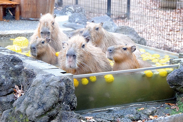 ゆず湯に入って気持ち良さそう 入園者に人気、東松山のこども動物公園でカピバラ温泉 足湯体験も